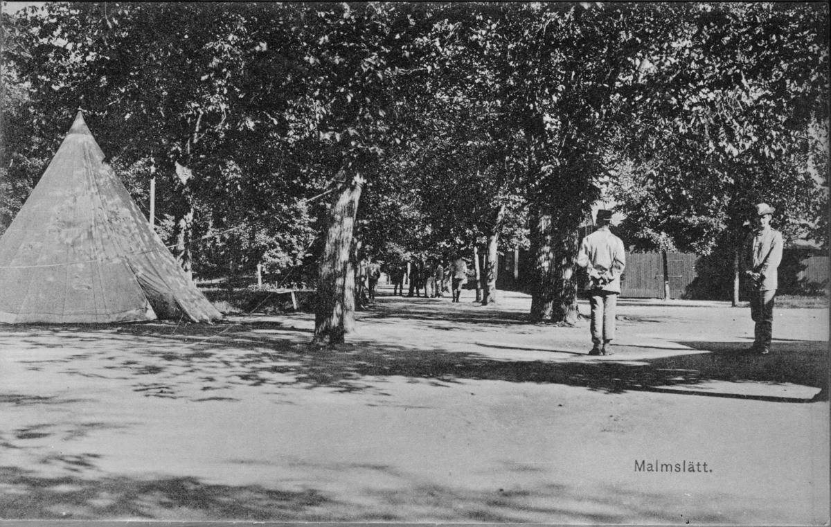 Parken vid andra livgrenadjärregementet I 5 på Malmen ca 1912. Miljöbild. Avfotografering av vykort.