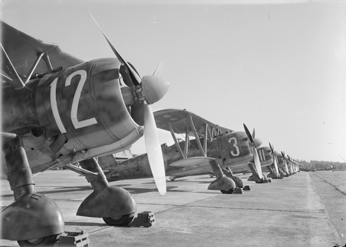 Flygplan J 11 uppställda på linje på F 3 Malmen.