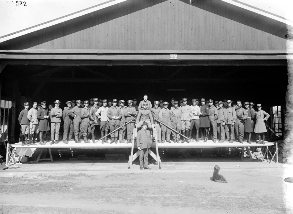 Grupporträtt. Provbelastning av flygplansvinge till flygplan J 23. Ett stort antal män står på en vinge i hangar.