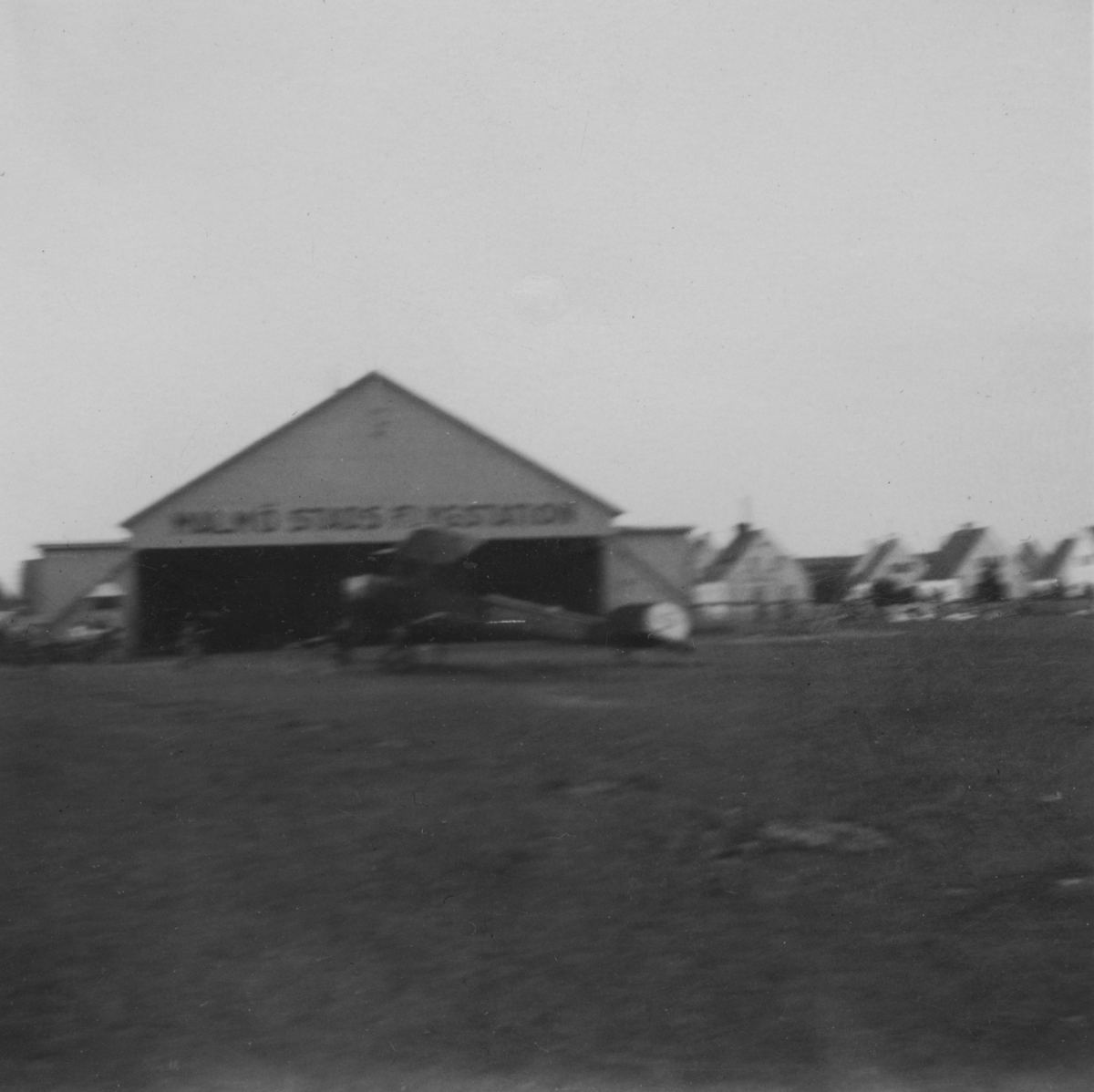 Hangar på Bulltofta flygstation under flygdag den 5 september 1926. Framför hangaren står ett flygplan.