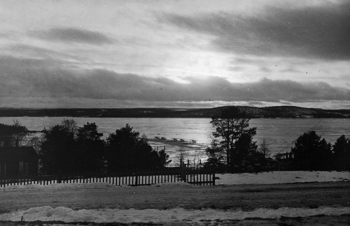 Utsikt över isbelagd sjö med fem militära flygplan S 6, Fokker C.V, står parkerade. Omkring 1930.