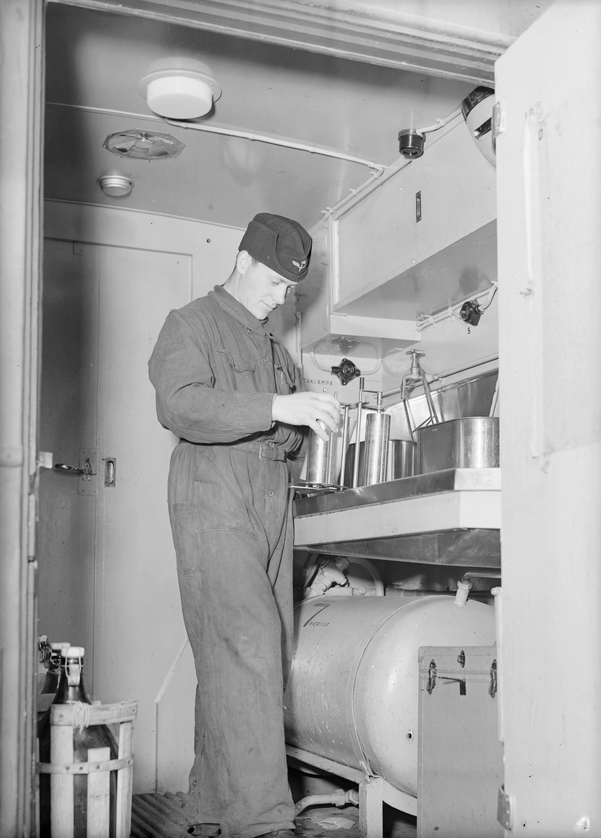 Framkallning i fotobil modell m/42. Fotoavdelning 3 mob. divisionen i arbete. Interiör.