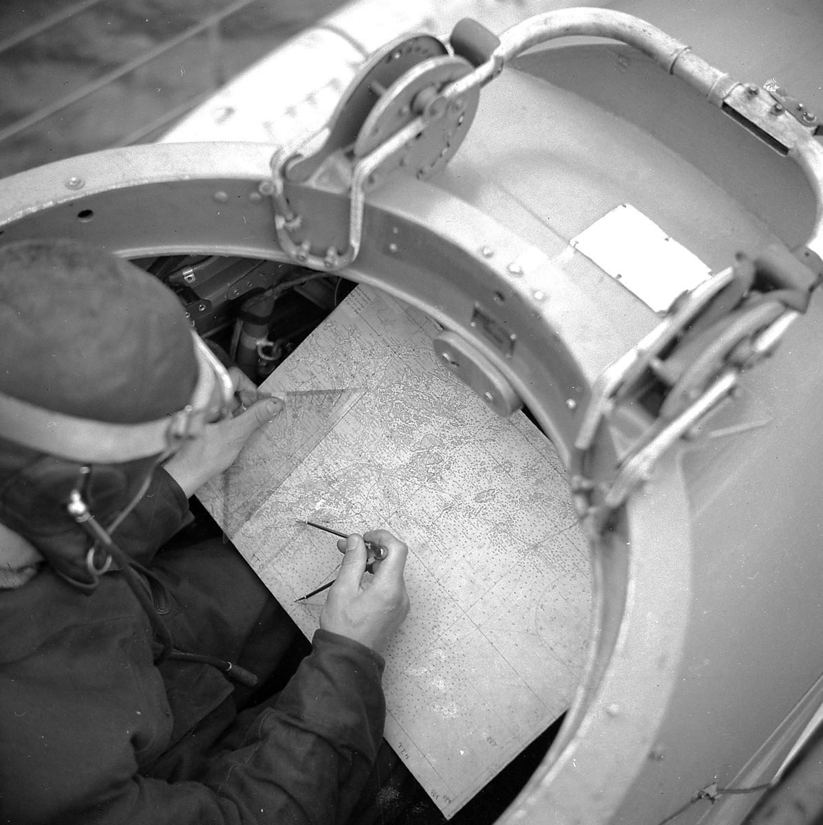 Flygspanare läser flygkarta på plats vid navigationsbord i flygplan S 9.