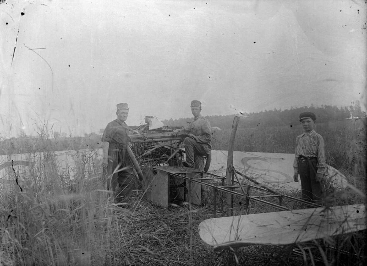 Ett havererat flygplan Thulin Typ A på Malmen. Två soldater och en pojke vid flygplanet.