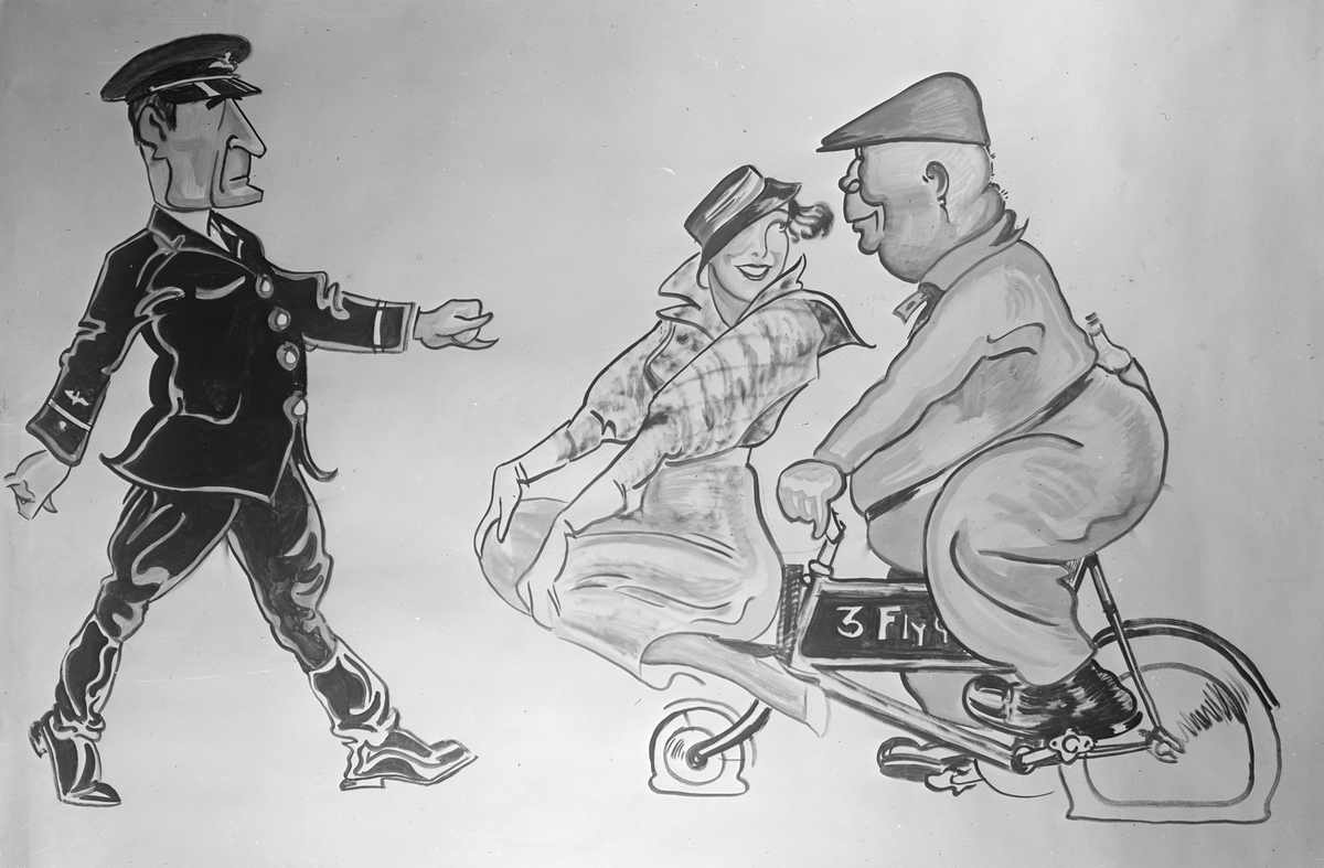 Karikatyrbild av fanjunkare Jagardt och förrådsman Kjellgren ur flygvapnet vid F 3 Malmen. Avfotograferad teckning.