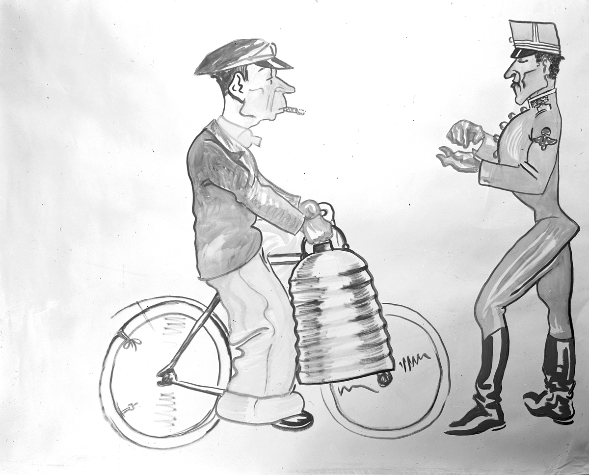 Karikatyrbild av kapten Lillier och förman Träff ur flygvapnet vid F 3 Malmen. Avfotograferad teckning.