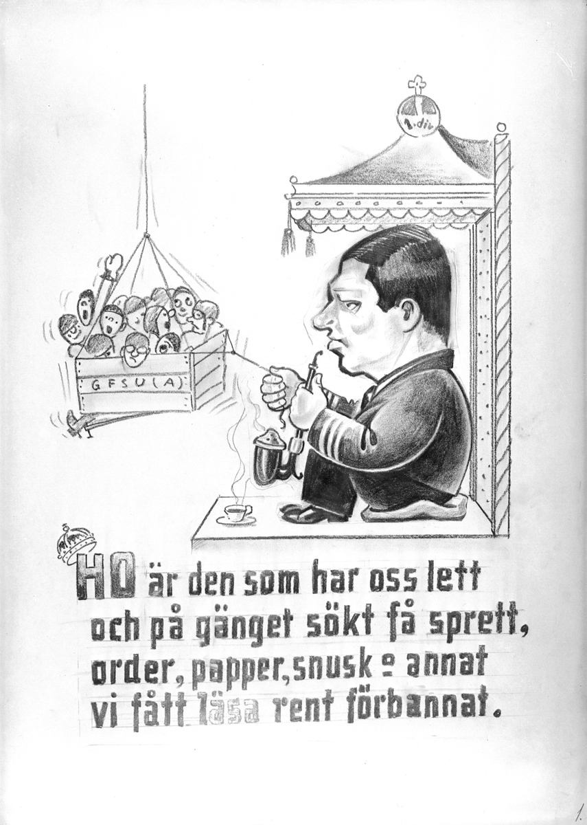 Karikatyrbild av militär ur flygvapnet, 1930-tal. Märkt 'HO'. Avfotograferad teckning.