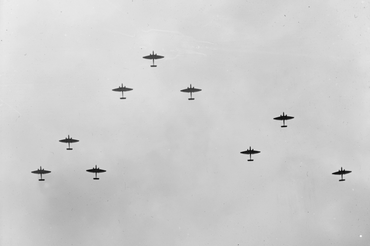 Nio stycken bombflygplan B 3 flyger i V-formation. Vy nedifrån.