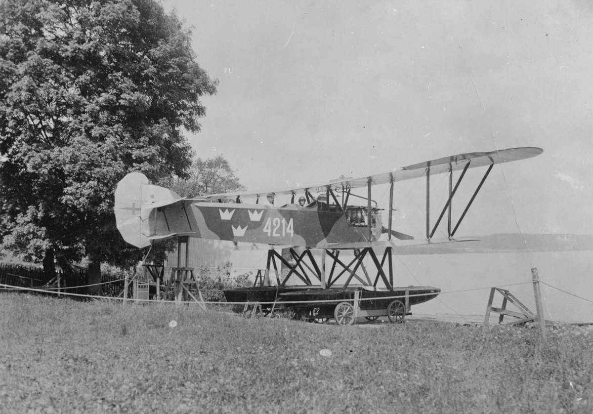 Flygplan FVM S 21 står uppställd på en vagn vid Roxens strand. Vid prov av flottörer. Flygare på plats i flygplanet.