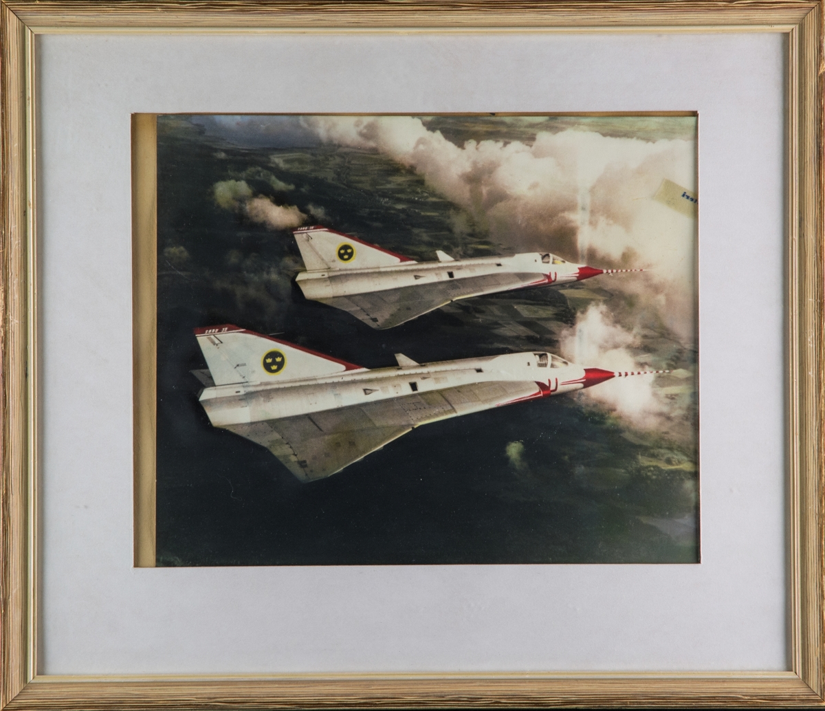 Två provflygplan Saab 35 Draken flyger över landskap.