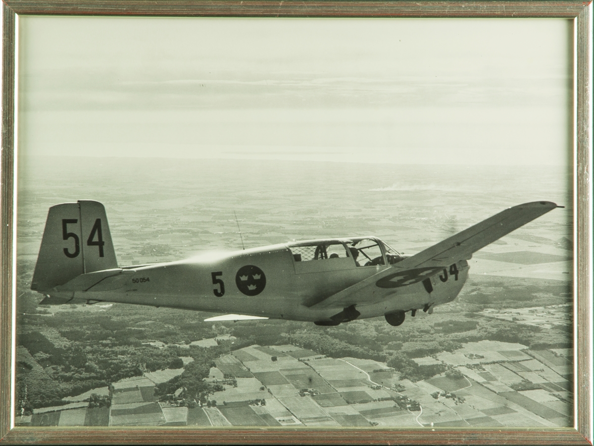 Flygplan SK 50 märkt nummer 54 från F 5 Krigsflygskolan i luften, flygande över landskap. Inramat foto.