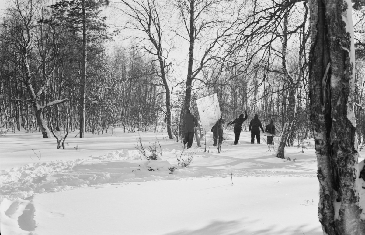 Delar till ett skyddshus för flygplan bärs av fem militärer i terräng vid F 19, Svenska frivilligkåren i Finland.