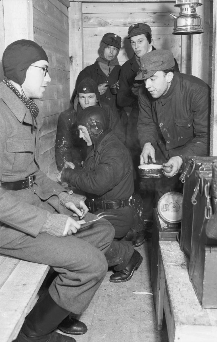 Matutspisning vid Svenska frivilligkåren i Finland, F 19. Sex militärer i matkö i ett trångt utrymme. På främre bas 'Oskar'