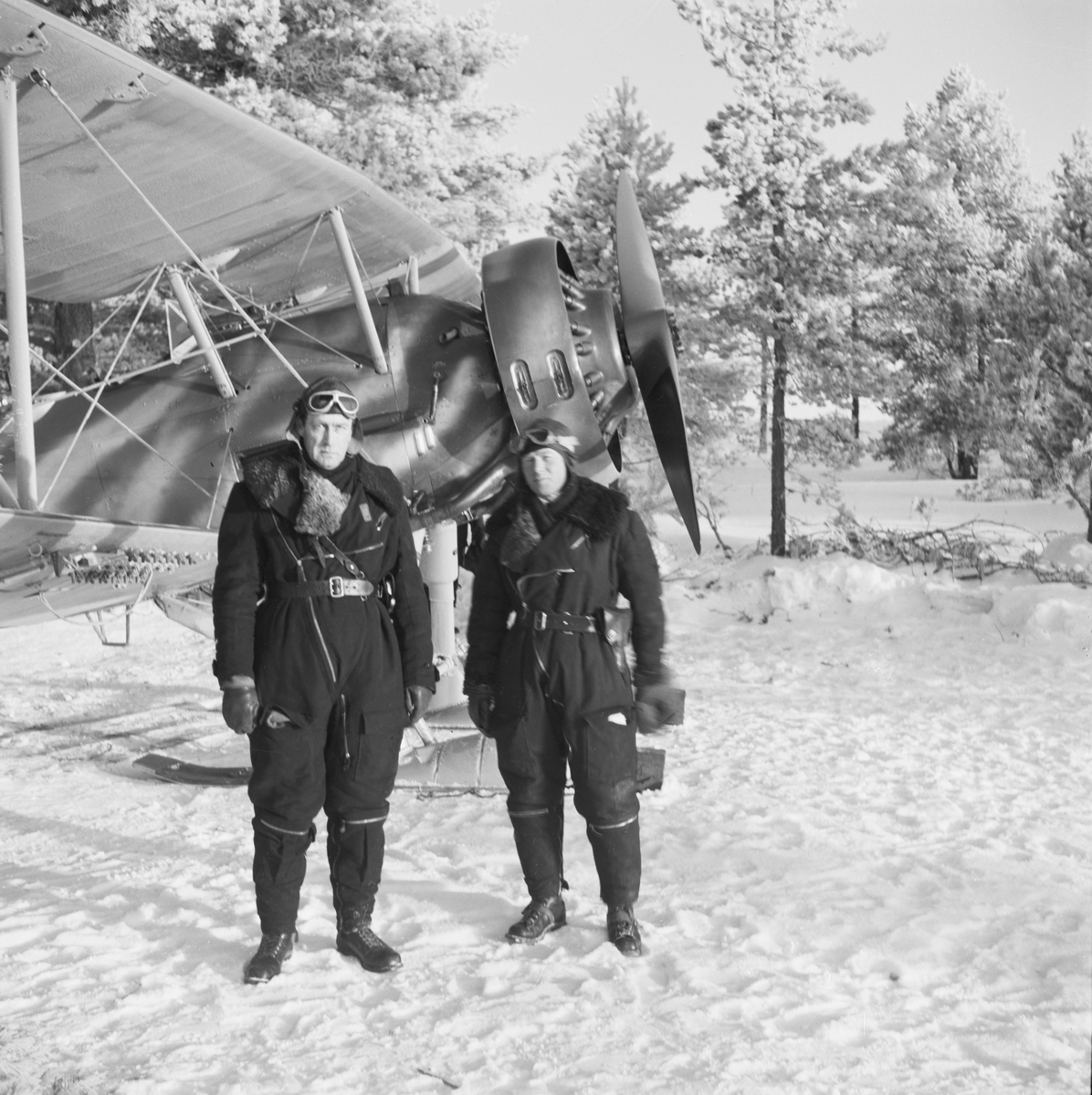 Hugo Beckhammar och Björn Bjuggren vid en B 4 Hawker Hart vid Svenska frivilligkåren i Finland, F 19.