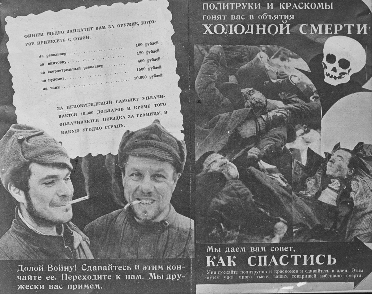 Reproduktion av flygblad: propaganda, från finska sidan till Röda Armé-soldater under finska vinterkriget 1939-1940. Kollage av foton och text.