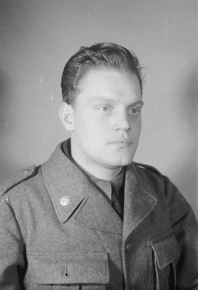 Porträttfoto av soldat Tord Lars Ivan Edström (nummer 931), kock vid F 19, Svenska frivilligkåren i Finland under finska vinterkriget, 1940.