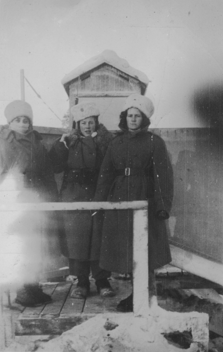 Porträttfoto av tre kvinnliga luftbevakare stående i ett luftbevakningstorn vintertid, 1942. Klädda i uniform och med gevär. Från vänster: Birgit Johansson, Karin Nordberg samt Inger (efternamn okänt). Luftbevakarna tillhörde 91:a ls-kompaniet i Tellejåkk, Kåbdalis under beredskapsåren.