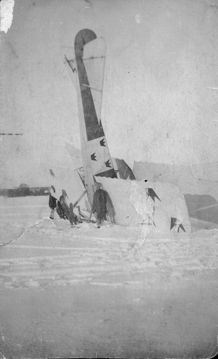 Havererat flygplan Albatros NAB 9 nummer 758 på Malmen den 14 januari 1918. Flygplanet står på nosen. Tre personer bredvid flygplanet. Vy snett bakifrån.