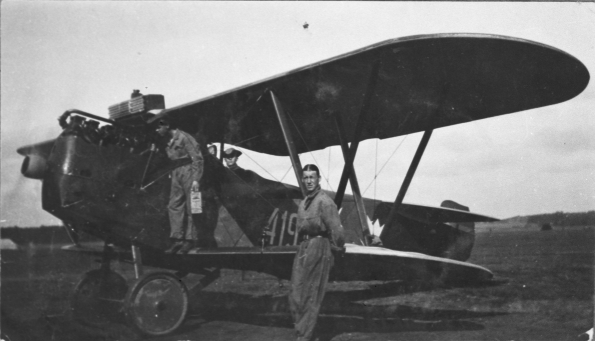 Motorkörning på flygplan Phönix C.I Dront märkt nummer 419? på ett flygfält. Tre tekniker vid planet.