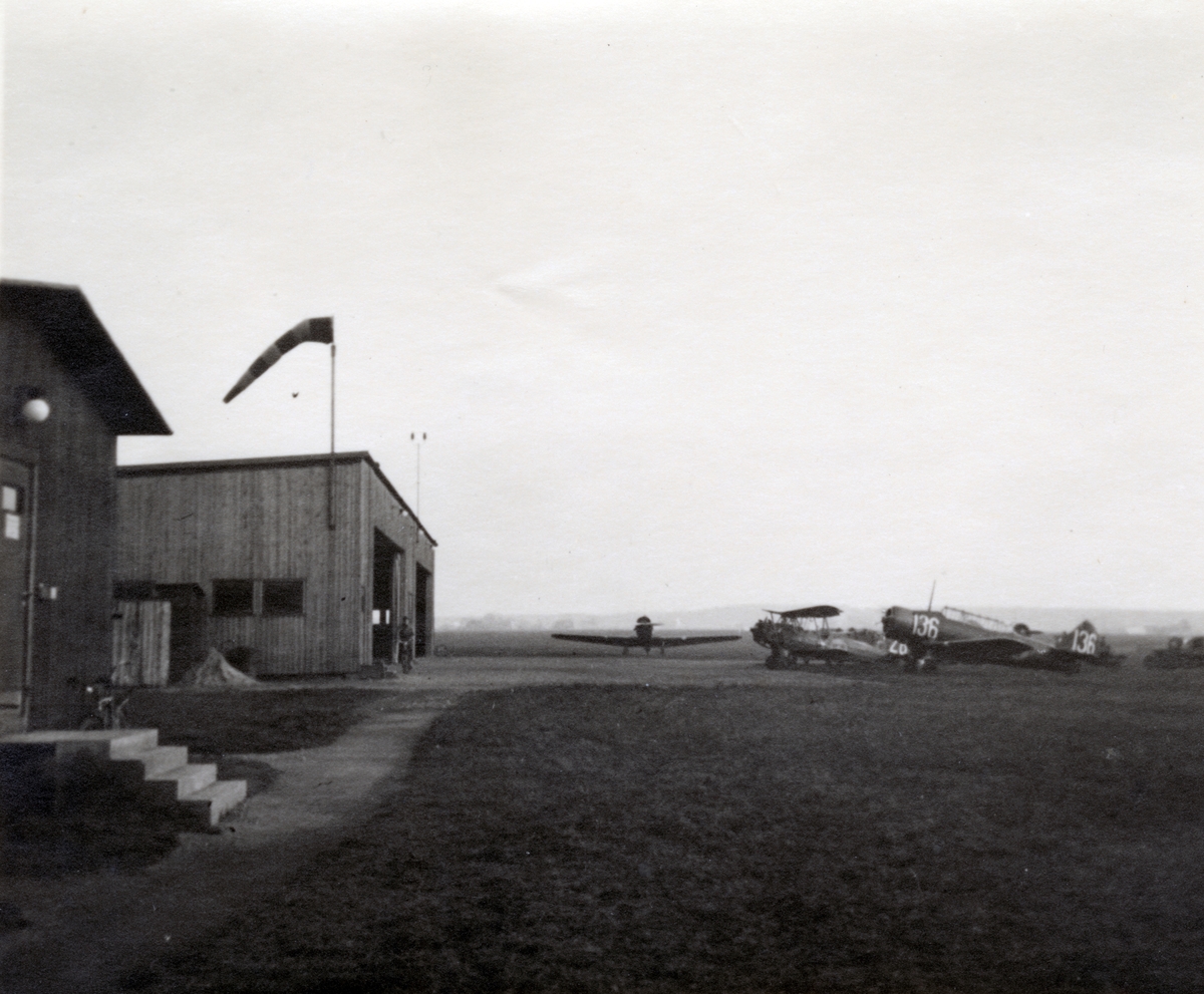 Militära skolflygplan står på flygfältet i Eslöv, 1943. Flygplan SK 12 och SK 15.