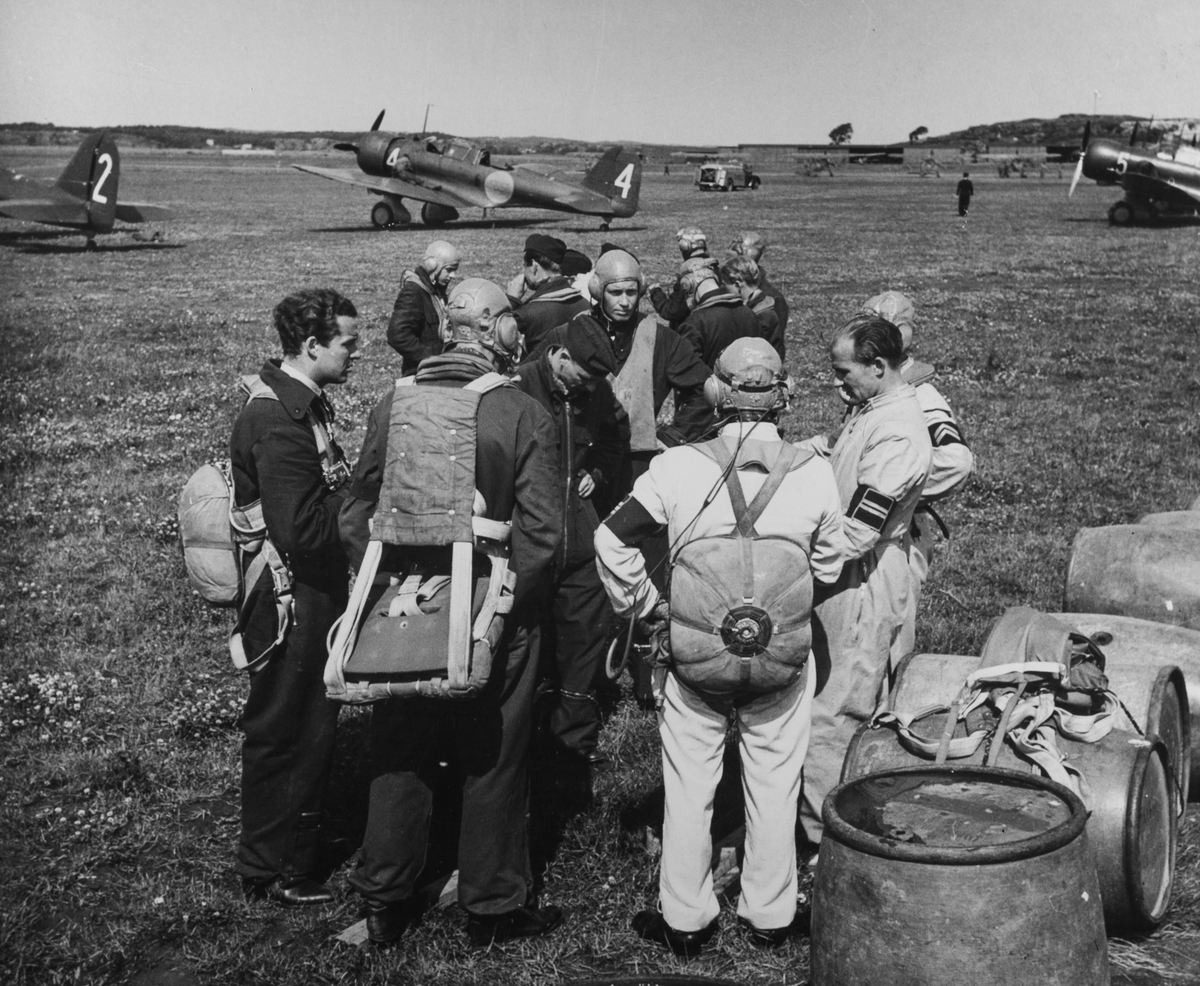 Militära flygare samlade på flygfält på F 9 Säve. I bakgrunden syns flygplan B 5.