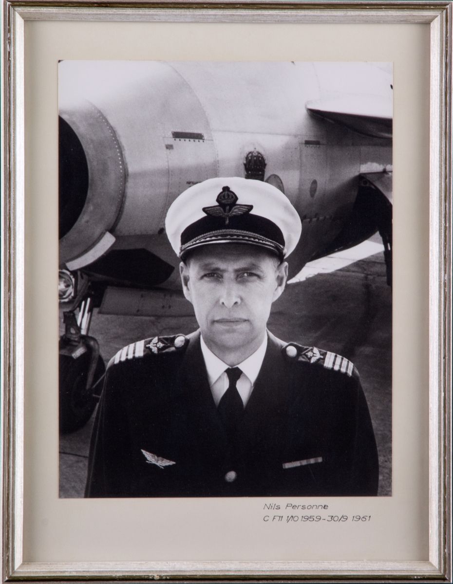 Porträttfotografi av Nils Personne, chef för F 11 Södermanlands flygflottilj 1959-1961 framför flygplan Saab 29 Tunnan. Inramat foto.