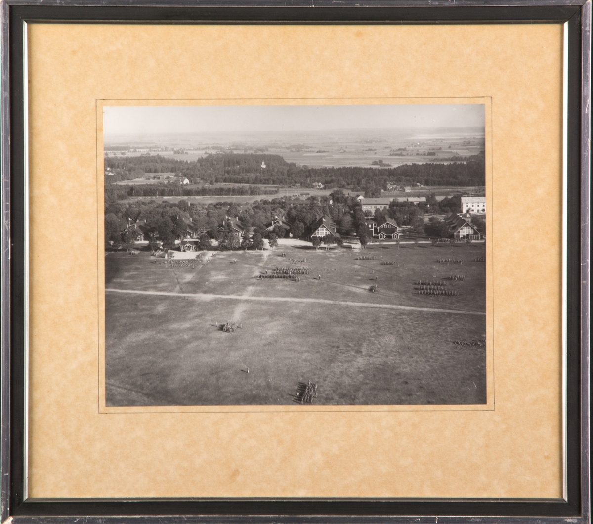 Flygfotografi av Andra livgrenadjärregementes läger på Malmen, 1922. Byggnader och militärer på övningsfält. Inramat foto.