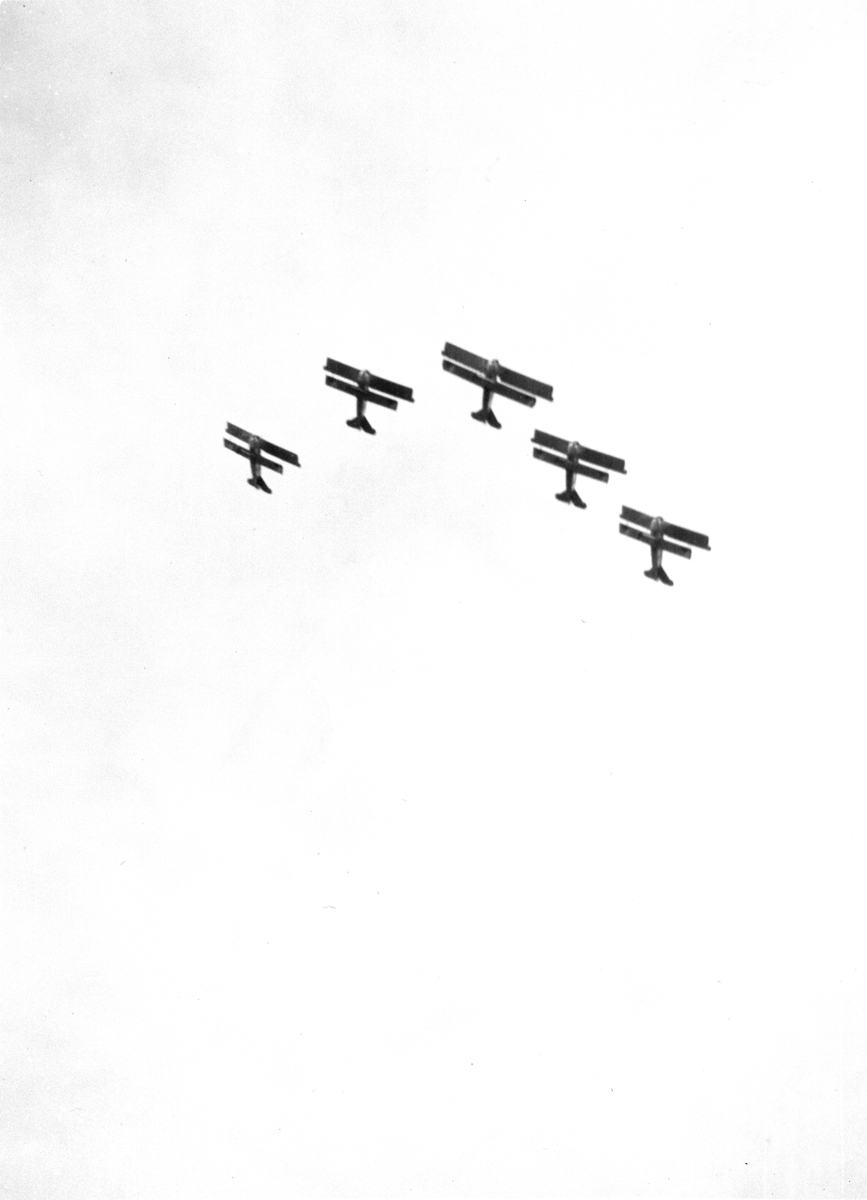 Fem stycken holländska flygplan Fokker D VII under uppvisning på Internationella luftfartsutställningen, ILUG, i Göteborg, 1923.