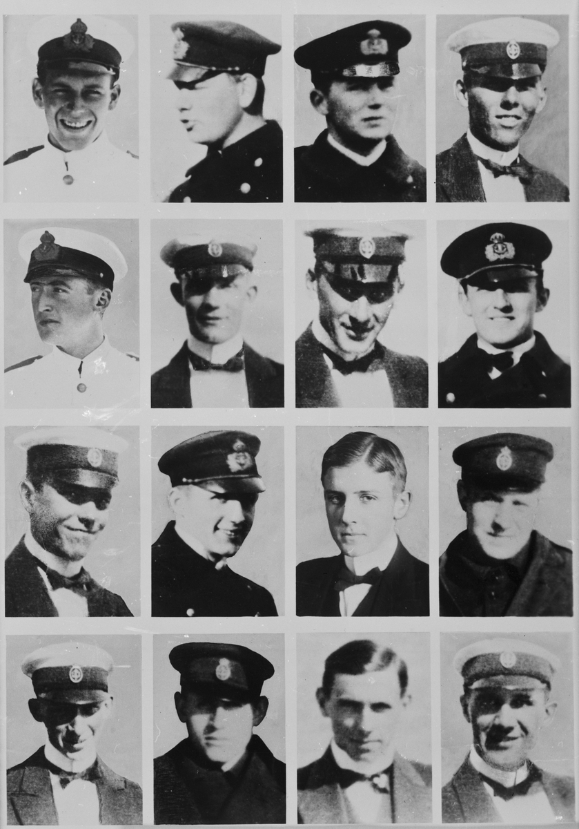 Porträttgalleri med svenska marinofficerare omkring 1930. Bland officerarna syns Olle Enderlein.