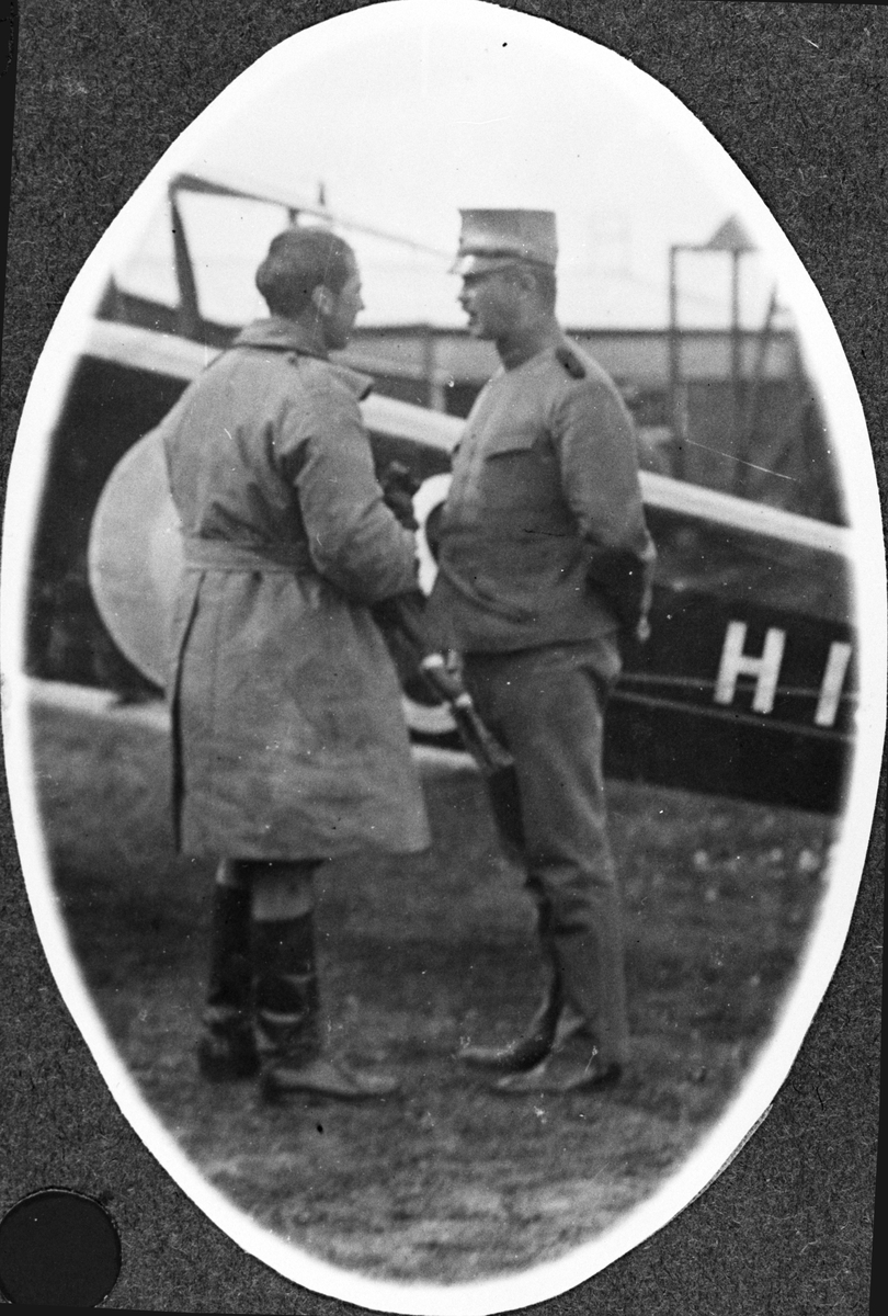 Ernst Fogman, chef för Flygkompaniet på Malmen, i samspråk med en man framför civilregistrerat flygplan Avro 504K tillhörande P O Flygkompani. Omkring 1919-1920.