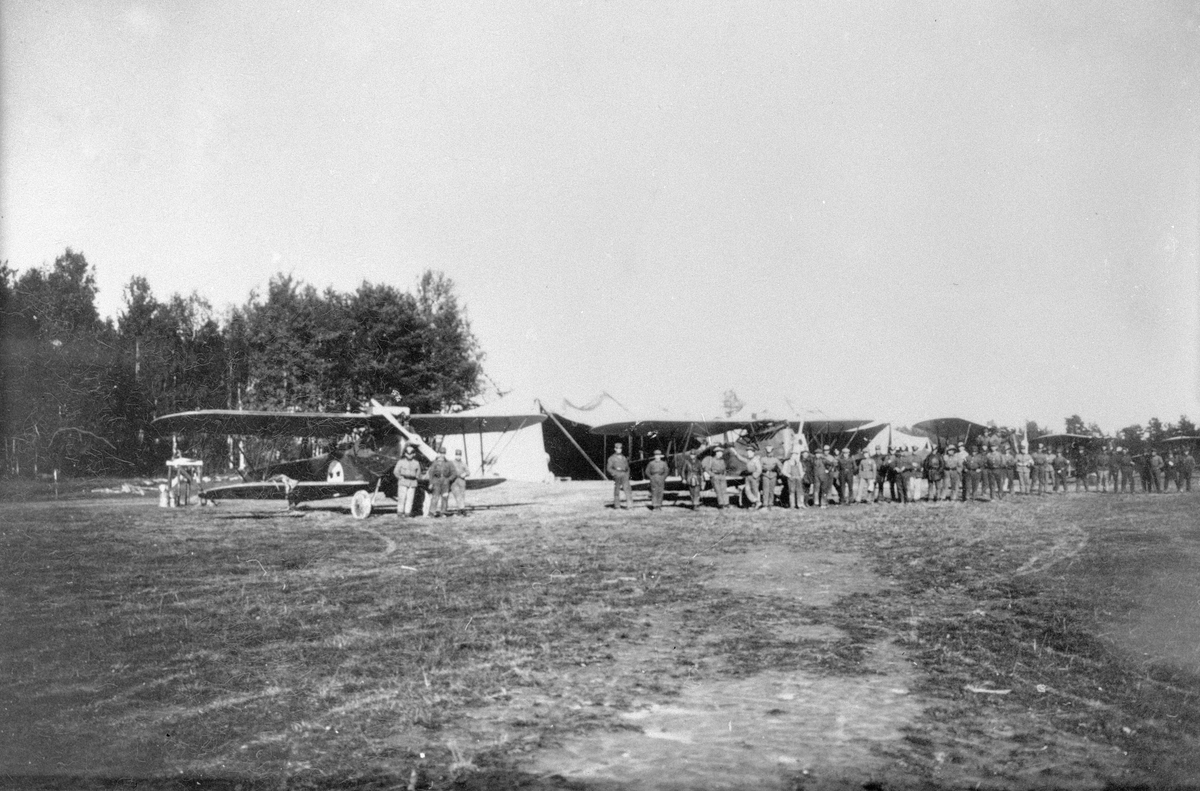 Militärer och flygplan FVM Dront uppställda på flygfält framför tälthangarer, omkring 1930.