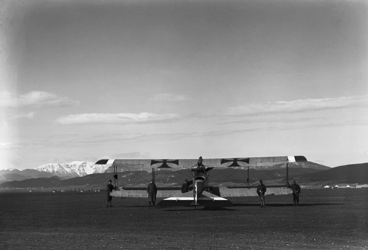 Militärt flygplan Albatros B.I märkt 20.03 tillhörande Österrike-Ungern står på ett fält. Fem män står vid flygplanet. Höga berg i bakgrunden. Vy rakt bakifrån.
