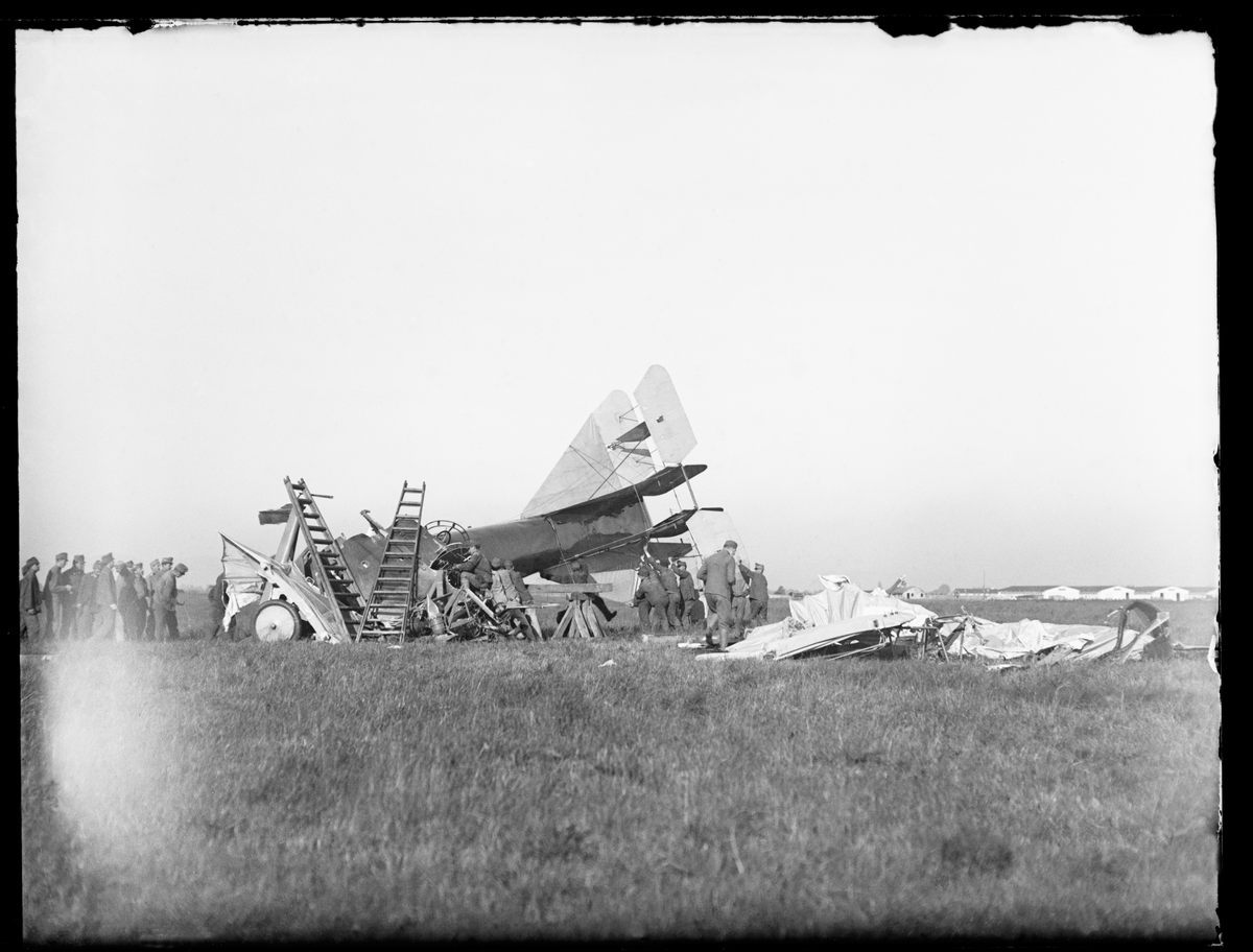 Militärt flygplan Aviatik märkt 30.07 tillhörande Österrike-Ungern ligger i spillror på ett flygfält efter haveri den 28 juli 1916. Militärer samlade vid flygplanet. Byggnader i bakgrunden. Vy från sidan.