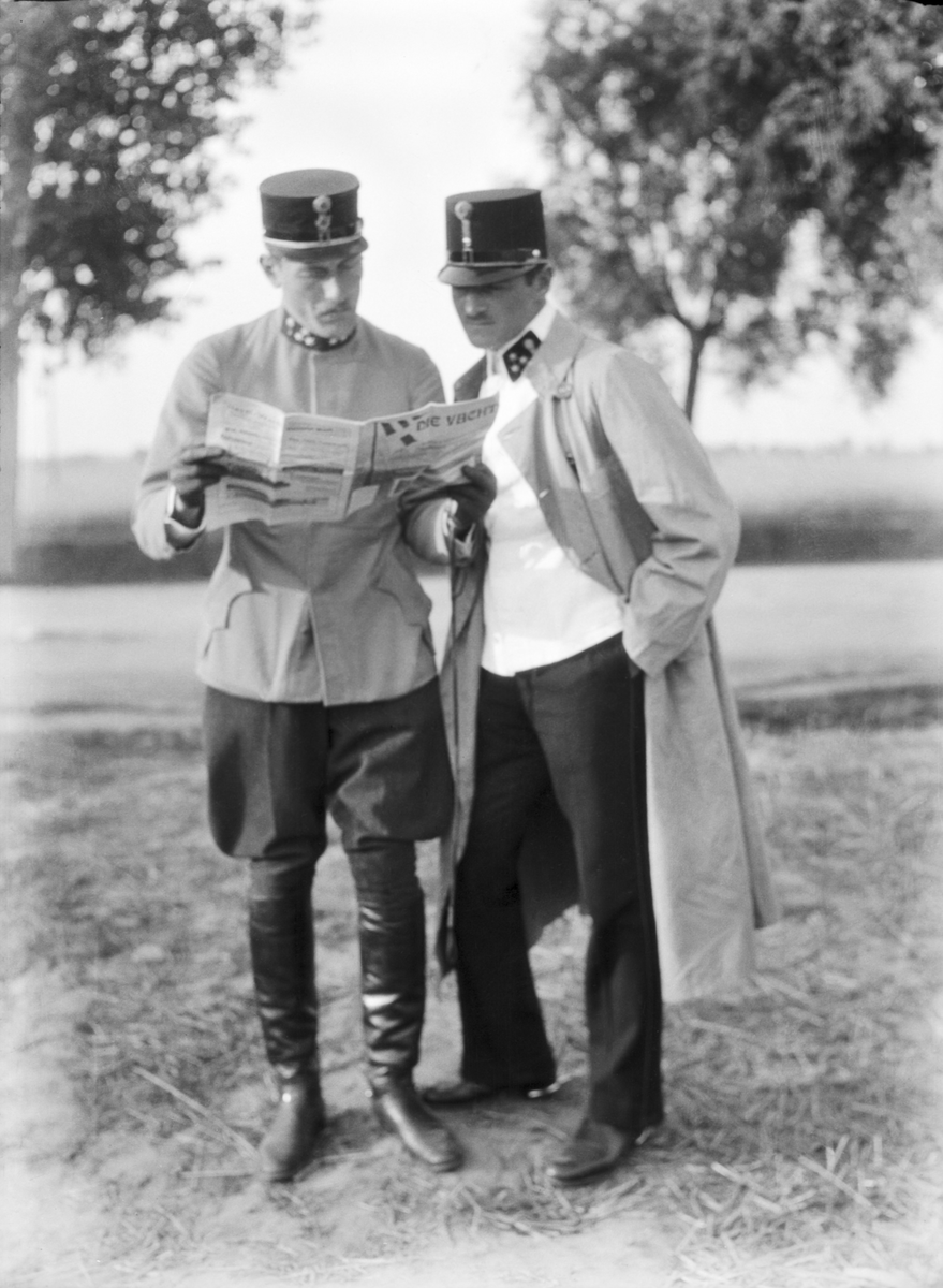 Två militärer från Österrike-Ungern står och läser tidning, Die Vacht, utomhus. Under första världskriget.
