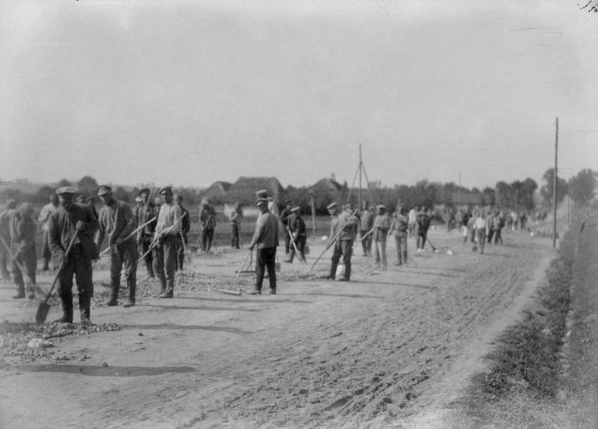 En stor samling män jobbar för hand med väganläggning i Centraleuropa under första världskriget. Utrustade med krattor och spadar. Tillhörande Österrike-Ungern.
