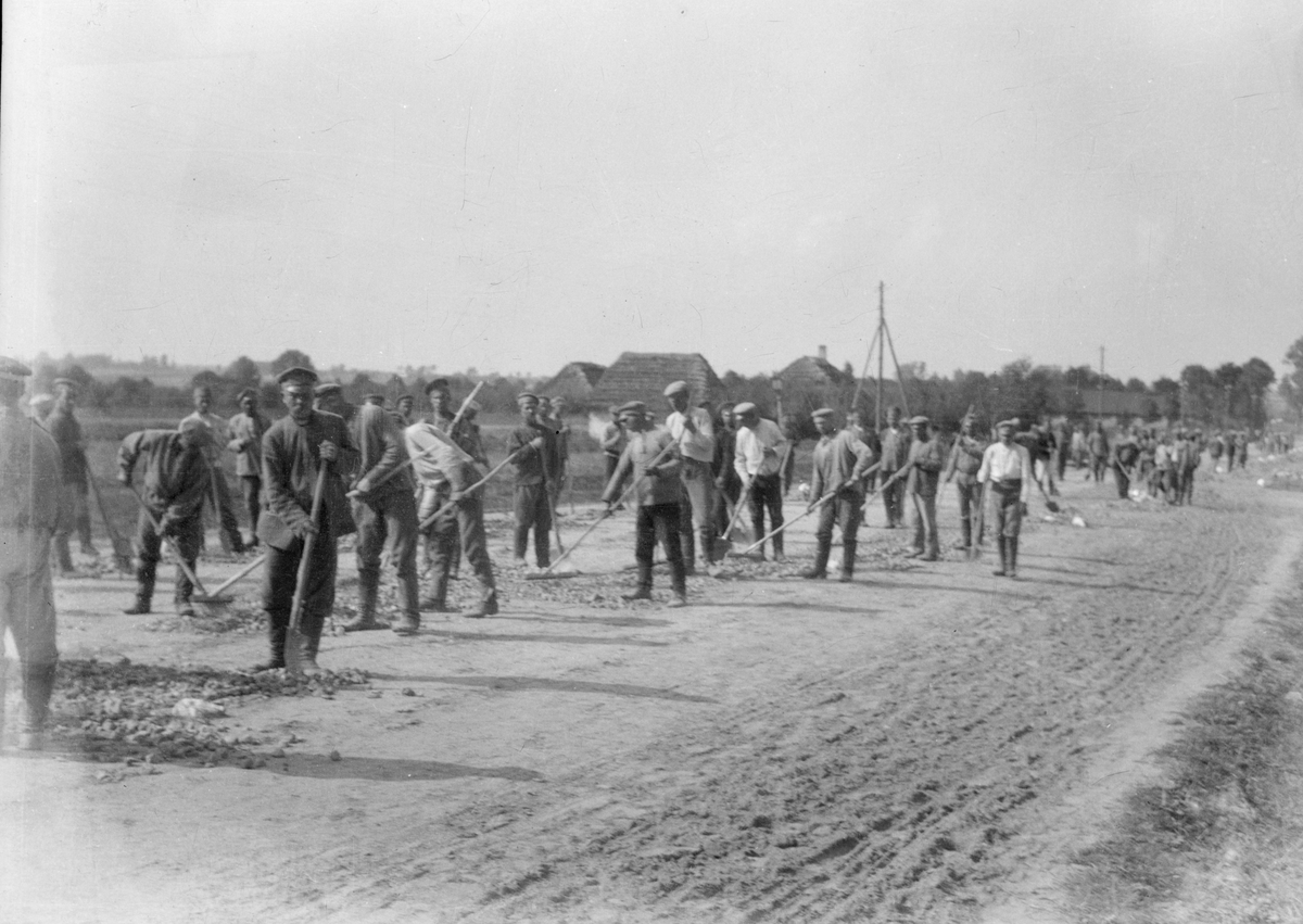 En stor samling män jobbar för hand med väganläggning i Centraleuropa under första världskriget. Utrustade med krattor och spadar. Tillhörande Österrike-Ungern.