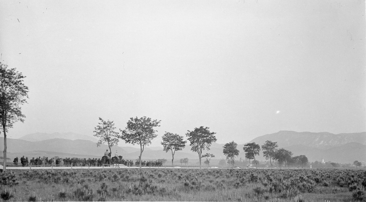 Titel: Vy över väg, höga berg, två ryttare och marscherande soldater i Österrike-Ungern cirka 1914-1915.