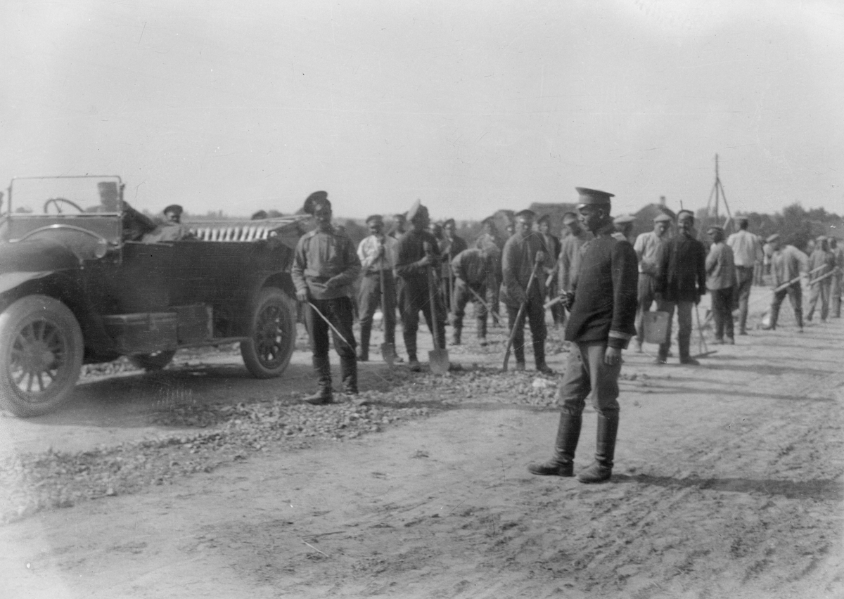 En stor samling män jobbar för hand med väganläggning i Centraleuropa under första världskriget. Utrustade med krattor och spadar. En bil står i förgrunden. Tillhörande Österrike-Ungern.