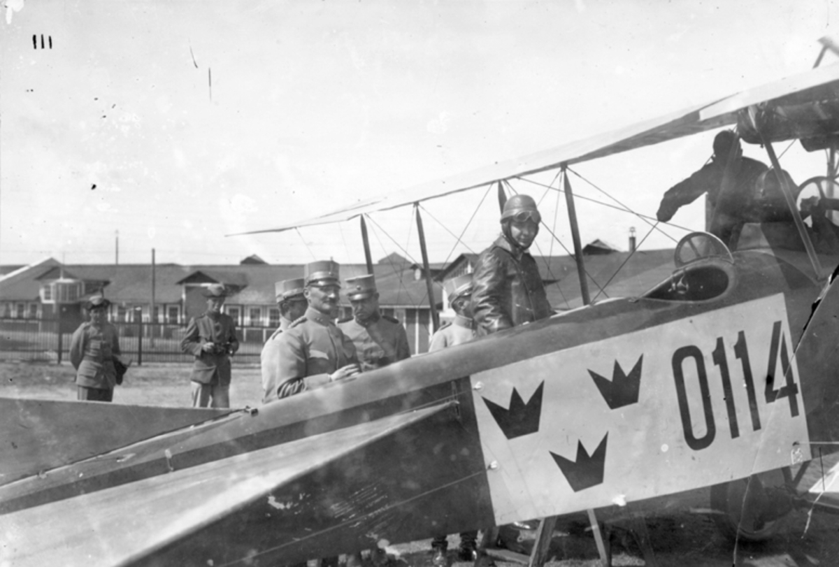 Officerare och flygpersonal kring flygplan FVM Albatros märkt 0114 på Malmen. Vid passagerarsitsen står försvarsmininster Per Albin Hansson och inväntar flygning.