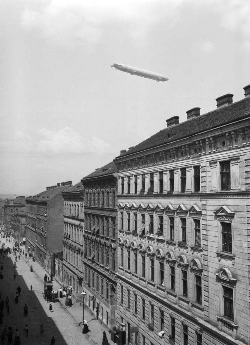 Militärt luftskepp i luften över hustak i Wien i Österrike-Ungern. En gata med hus, människor och häst och vagn. Vy från sidan.