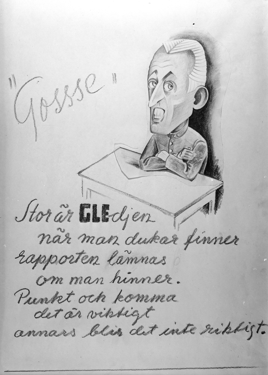 Karikatyrbild av militär ur flygvapnet, 1930-tal. Märkt 'GLE'. Avfotograferad teckning.