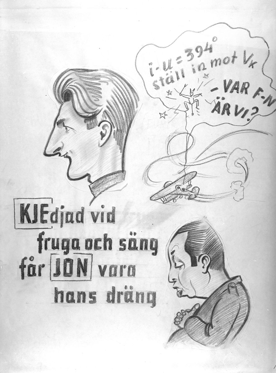 Karikatyrbild av militärer ur flygvapnet, 1930-tal. Märkt 'JON', 'KJE'. Avfotograferad teckning.