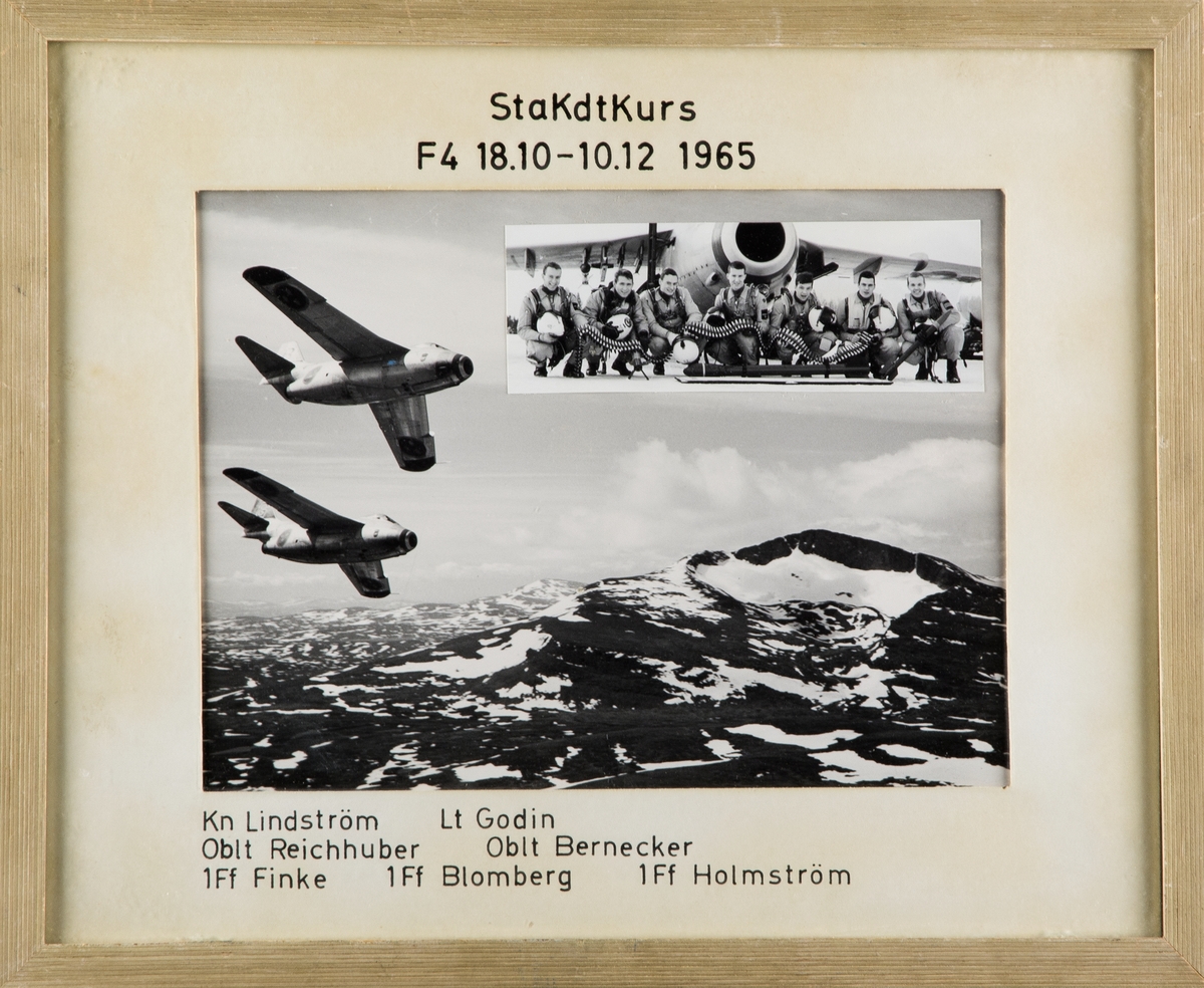 Fotokollage. Grupporträtt av deltagare i 'StaKdtKurs' på F 4 Frösön år 1956 sitter med vapenalternativ framför flygplan J 29; samt två flygplan J 29 i roteflygning över bergsmassiv. Inramat foto.