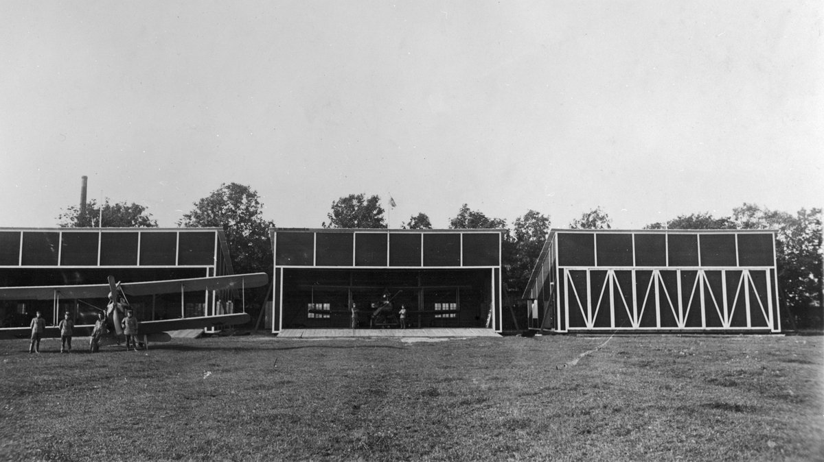 Trähangarer på flygstationen på Tenggrenstorp i Vänersborg, omkring 1916-1923. Flygplan och militärer framför. Hangarerna flyttades till Flygkompaniet på Malmen 1923 och kallades där G-hangarerna.