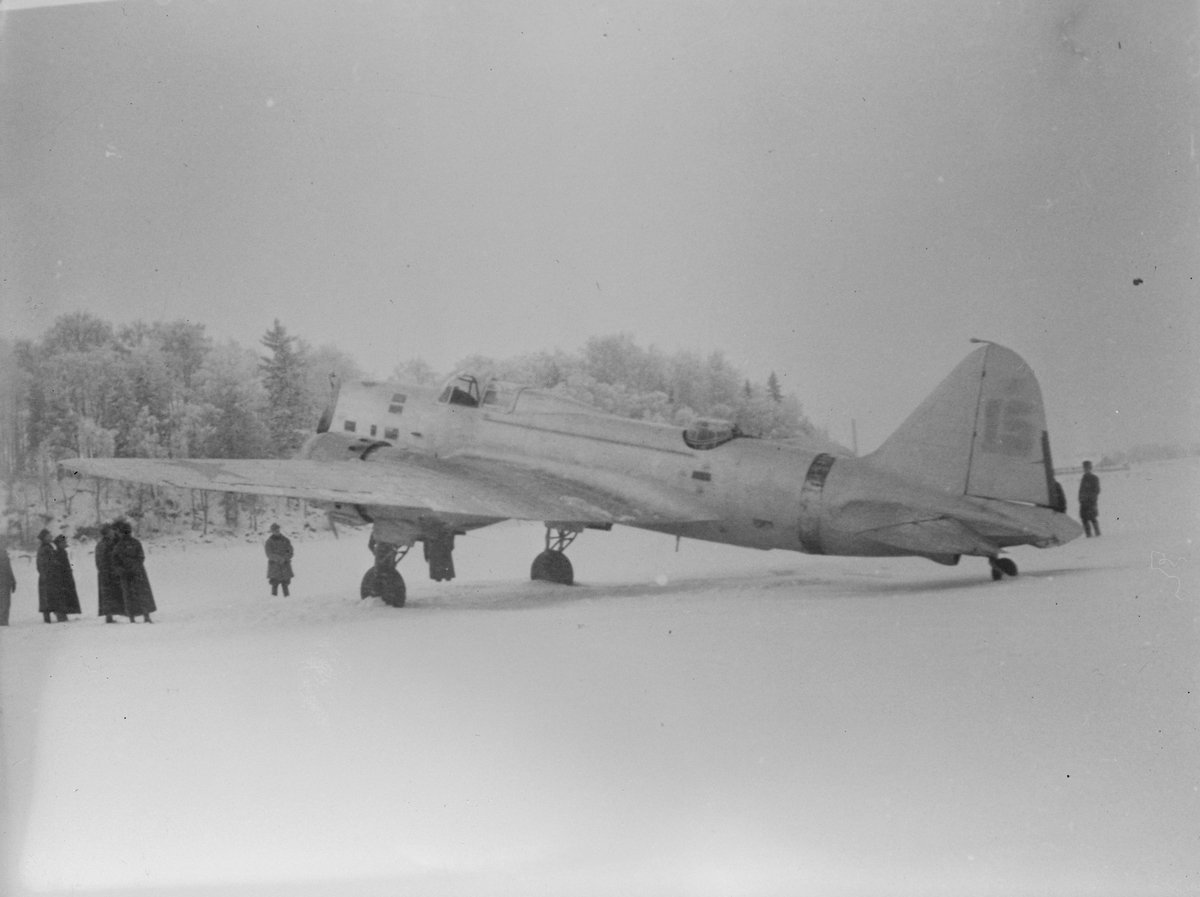 Sovjetiskt flygplan Iljushin DB-3 står på ett fält under finska vinterkriget, 1940. Människor i rörelse runtomkring. Vy bakifrån. Bild från F 19, Svenska frivilligkåren i Finland.