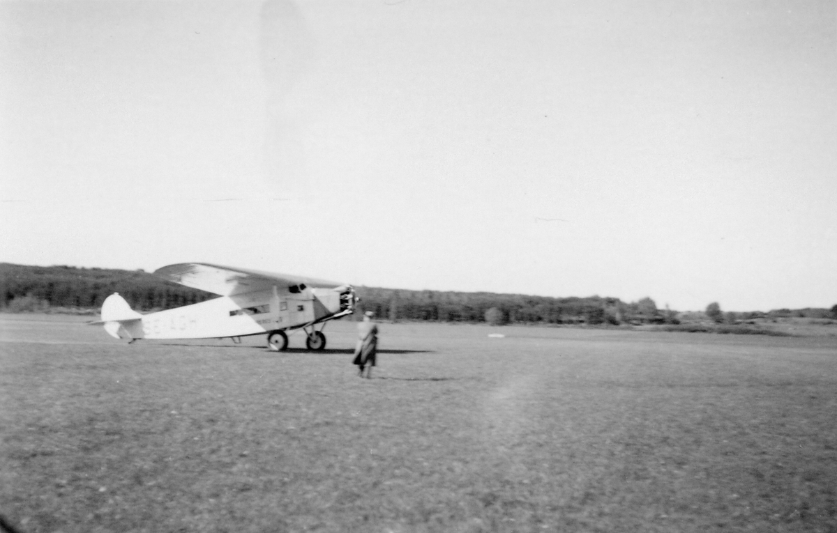Flygplan Fokker med civil märkning SE-AGH tillhörande Ahrenbergsflyg står på ett flygfält. En person går mot flygplanet.