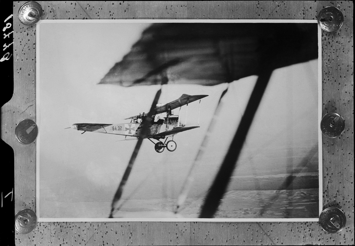 Militärt flygplan Hansa Brandenburg C.I märkt 64.32 tillhörande Österrike-Ungern i luften. Flygbild, från sidan med flygplansvinge i förgrunden. Repro.