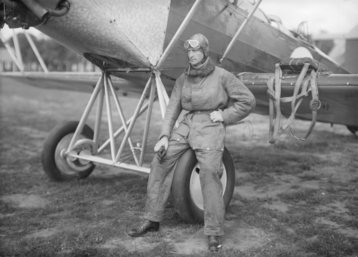 Porträtt av löjtnant i flygdräkt framför flygplan S 6 på Malmen.