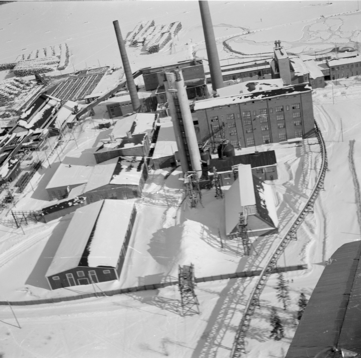 Flygfotografi av pappersmassefabriken i Veitsiluoto. Bild från F 19, Svenska frivilligkåren i Finland.