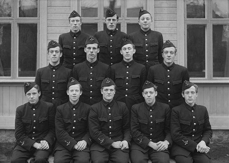 Elever vid vicekorpralskolan för signalister på F 3 Östgöta flygflottilj, 1944-1945. Grupporträtt framför byggnad.